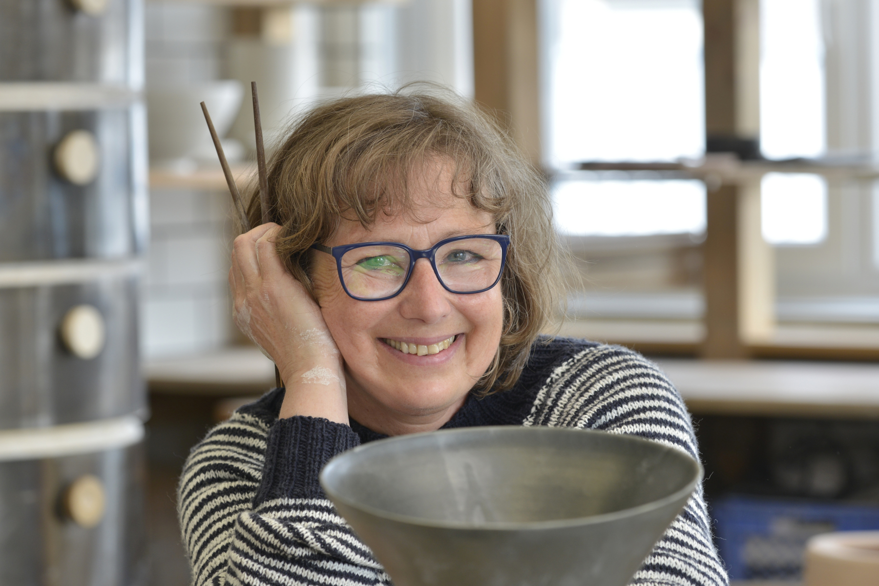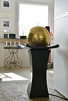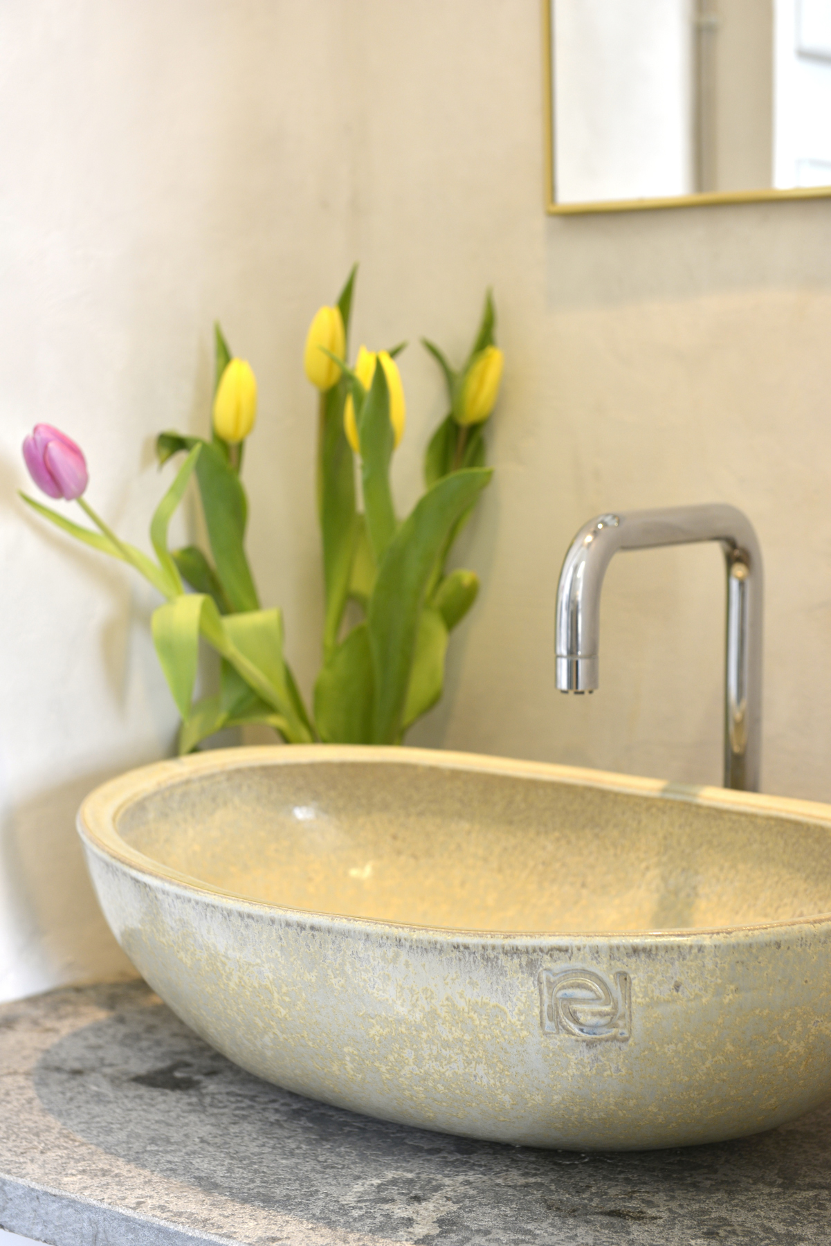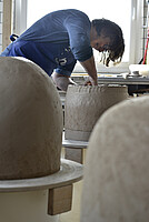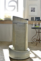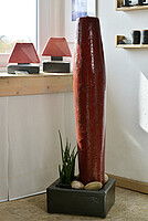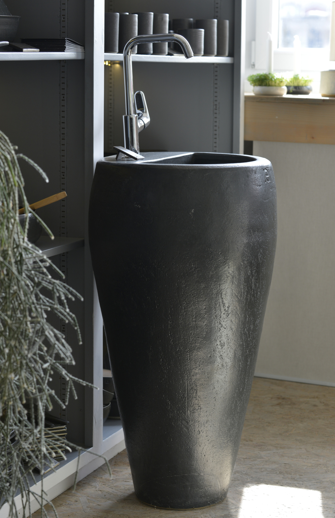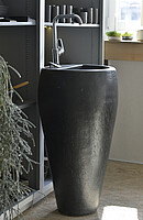 Meine Schwerpunkte sind Pflanz- Feuer- und Wasserobjekte für den Innen- und für den Außenbereich sowie Geschirr. Die Objekte erreichen eine Höhe von bis zu 2 m und einen Durchmesser bis zu 60 cm. Sie werden von mir in einer traditionellen, in Vergessenheit geratenen asiatischen Aufbau-Technik ohne maschinelle Hilfe hergestellt. Durch die hohe Brenntemperatur und der Verwendung einer geeigneten Steinzeugmasse sind alle Keramiken wasserdicht und frostsicher. Mir ist die schlichte, schwungvolle Formgebung meiner Objekte wichtig. Viele Brunnen ermöglichen die Vereinigung von Wasserspiel, Feuerschale und/oder Pflanzeinsatz und sorgen für eine Atmosphäre, welche die Sinne, den Körper und die Seele des Betrachters anregt. Mein Ziel ist es, die Keramiken an ihre Umgebung anzupassen, so dass sie sich harmonisch in den Gesamtraum einfügen. Form, Größe und Farbe werden daher von mir individuell nach Wunsch angefertigt. Mein Geschirr besticht durch seine schlichte Form- und Farbgebung. Es erinnert an einen japanischen Stil. Jedes Lebensmittel kommt auf der schwarzmatte Glasur sehr gut zur Geltung, sodass das Auge mit isst. Auch bei Küchenaccessoires, wie Saft-, Wein- und Ölspendern, Kräuterdosen, Teedosen und Brottöpfen...lege ich auf Schlichtheit und Funktionalität sehr viel Wert und sie sollen die Küche verschönern. Durch die hohe Brenntemperatur von 1245°C ist mein Steinzeuggeschirr spülmaschinenfest, mikrowellentauglich und wasserdicht. Zusätzlich stelle ich auch Auflaufformen her. Jedes meiner Stücke ist einzeln von Hand gedreht oder aufgebaut.